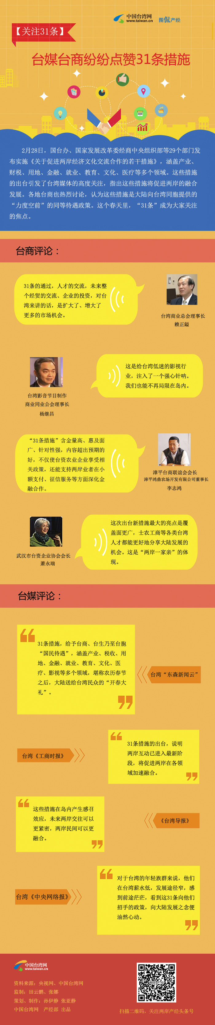 2月28日,國臺辦、國家發(fā)展改革委經(jīng)商中央組織部等29個部門發(fā)布實施《關于促進兩岸經(jīng)濟文化交流合作的若干措施》,涵蓋產(chǎn)業(yè)、財稅、用地、金融、就業(yè)、教育、文化、醫(yī)療等多個領域。這些措施的出臺引發(fā)了臺灣媒體的高度關注,指出這些措施將促進兩岸的融合發(fā)展。各地臺商也熱烈討論,認為這些措施是大陸向臺灣同胞提供的“力度空前”的同等待遇政策。這個春天里,“31條”成為大家關注的焦點。