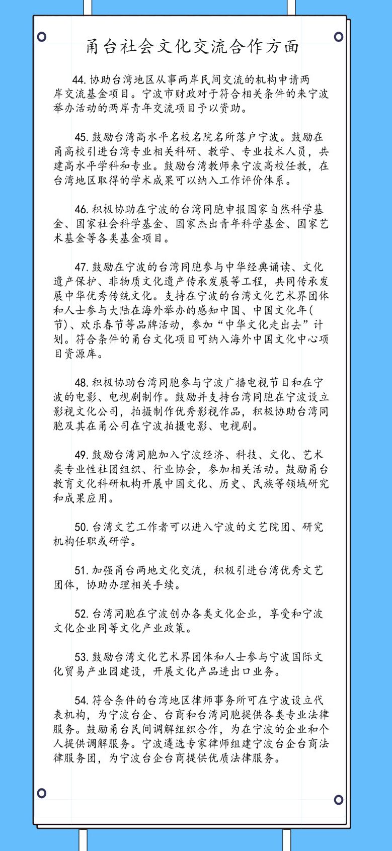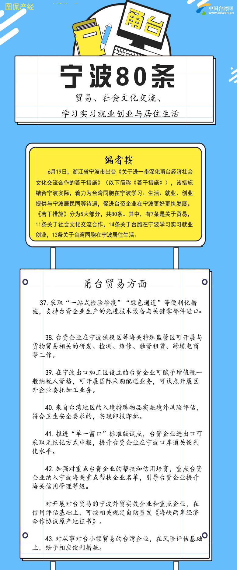 編者按:6月19日,浙江省寧波市出臺《關(guān)于進一步深化甬臺經(jīng)濟社會文化交流合作的若干措施》(以下簡稱《若干措施》),該措施結(jié)合寧波實際,著力為臺灣同胞在寧波學(xué)習(xí)、生活、就業(yè)、創(chuàng)業(yè)提供與寧波居民同等待遇,促進臺資企業(yè)在寧波更好更快發(fā)展。《若干措施》分為5大部分,共80條。其中,有7條是關(guān)于貿(mào)易,11條關(guān)于社會文化交流合作,14條關(guān)于臺胞在寧波學(xué)習(xí)實習(xí)就業(yè)創(chuàng)業(yè),12條關(guān)于臺灣同胞在寧波居住生活。