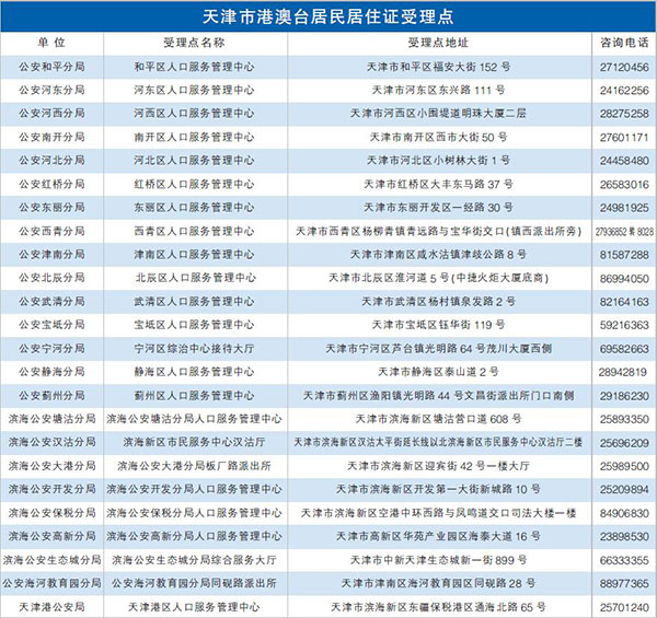 天津北方網(wǎng)訊:在昨日召開的在津港澳臺居民居住證申領(lǐng)發(fā)放辦法座談會上,我市公安機關(guān)就港澳臺居民在津申領(lǐng)居住證的政策進行了詳細解讀。從9月1日起,公安機關(guān)本著“就近、方便”的原則,在全市各區(qū)共設(shè)置了24個受理點,全面開展港澳臺居民居住證受理業(yè)務。