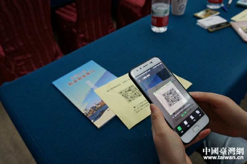 臺(tái)灣青年掃描二維碼關(guān)注廈門人才網(wǎng)官方網(wǎng)站微信公眾號(hào)。(中國臺(tái)灣網(wǎng) 汪明珠 攝)