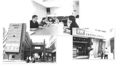 在中關(guān)村國家自主創(chuàng)新示范區(qū)創(chuàng)新型孵化器——車庫咖啡局促狹窄的會議室里,前來取經(jīng)的各方人士絡繹不絕。圖為車庫咖啡管理合伙人李燕(右一)接待來訪者。(照片由經(jīng)濟日報記者 曹紅艷攝)