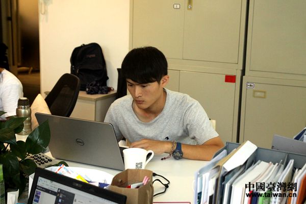 臺(tái)灣大學(xué)生洪德麟正在工作中(中國(guó)臺(tái)灣網(wǎng) 陳文韜 攝) 臺(tái)灣大學(xué)生潘俐曄在一次活動(dòng)中負(fù)責(zé)簽到和布置會(huì)場(chǎng)(中國(guó)臺(tái)灣網(wǎng) 陳文韜 攝)