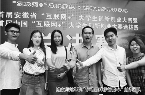 “走在雨中,一手撐傘、一手舉著自拍桿拍照,可惜拍著拍著手機就沒有電了——這就是一場悲劇!不過,用上我們研發(fā)的‘多功能環(huán)保智能傘’后,浪漫的雨中自拍再也不會變成悲劇啦!”淮南師范學院美術與設計學院產(chǎn)品設計專業(yè)的同學們說。