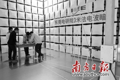 4日,在電研院的電磁兼容公共實驗室內,記者看到石龍鎮(zhèn)富華電子所生產的電源適配器正進行電磁輻射檢測:工程師在密閉的實驗室內開啟電源適配器后,在另一個房間內實時監(jiān)測電磁輻射數據。