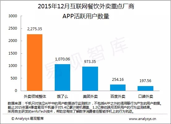 用戶活躍度方面,2015年12月的外賣市場整體APP活躍用戶數(shù)量為2275.35萬戶,其中,餓了么活躍用戶達(dá)1070.06萬戶,占比接近一半,美團(tuán)外賣活躍用戶達(dá)973.350萬戶,二者組成第一集團(tuán)。由百度外賣和口碑外賣組成的第二集團(tuán)則分別只有200多萬的的活躍用戶,差距較大。