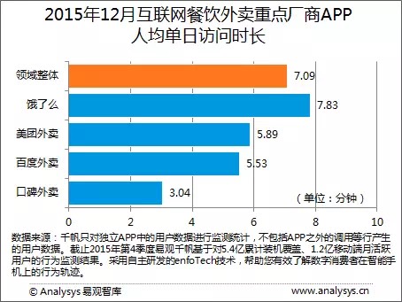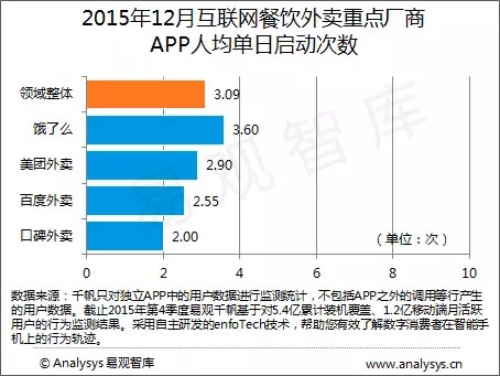 數(shù)據(jù)顯示,2015年12月餓了么的人均單日訪問時長為7.83分鐘,高于外賣領(lǐng)域整體APP人均單日訪問時長的7.09分鐘。在人均單日啟動次數(shù)方面,餓了么以3.6次同樣位居第一。