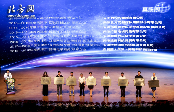 開幕式上,與會領(lǐng)導(dǎo)為2015至2016年度“天津市互聯(lián)網(wǎng)行業(yè)8大類型領(lǐng)軍企業(yè)”頒牌。天津北方網(wǎng)新媒體集團(tuán)股份有限公司榮獲“互聯(lián)網(wǎng)新媒體”領(lǐng)軍企業(yè)榮譽(yù)稱號。