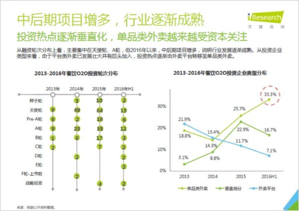 外賣(mài)O2O依然處于井噴階段,用戶(hù)的消費(fèi)能力增加也導(dǎo)致了其從價(jià)格敏感轉(zhuǎn)向了品質(zhì)敏感,也在反過(guò)來(lái)倒逼整個(gè)外賣(mài)行業(yè)的質(zhì)量提升,安全、餐飲品類(lèi)、物流等等通通需要全面的提升,單品和垂直類(lèi)外賣(mài)之所以在后期受到投資青睞正是因?yàn)槠淠軌蚋鼮閷?zhuān)注的做到從安全到物流的各項(xiàng)品質(zhì)服務(wù),而其服務(wù)的用戶(hù)也偏中高端,有著更高的消費(fèi)能力與黏性,可以最早實(shí)現(xiàn)盈利,繼而成為投資的新寵。