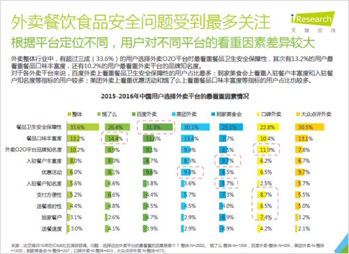 消費(fèi)能力的提高通常也伴隨著對(duì)于品質(zhì)要求的提高,艾瑞將每一個(gè)用戶(hù)評(píng)判品質(zhì)的維度做了一個(gè)全面的統(tǒng)計(jì),安全問(wèn)題、口味豐富、平臺(tái)知名度等等都是用戶(hù)考量的因素。