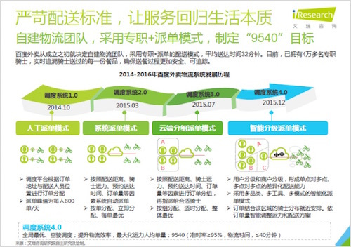 以百度外賣(mài)為例,其背后有著百度強(qiáng)大的人工智能調(diào)度作為支撐,因此在外賣(mài)方面也是在一開(kāi)始就建立了以大數(shù)據(jù)人工智能挖掘作為基礎(chǔ)的配送,其在2014年上線(xiàn)之初就采用派單模式,其從第一階段為較為簡(jiǎn)單的人工派單形式,進(jìn)化到了第四階段開(kāi)始對(duì)商戶(hù)進(jìn)行更精確的分級(jí)、并采用多品類(lèi)、多工具、多模式的智能化派單模式,其中展示了大數(shù)據(jù)技術(shù)的進(jìn)化,最終達(dá)到了準(zhǔn)時(shí)率98.78%,平均物流時(shí)間小于32分鐘的成績(jī)。