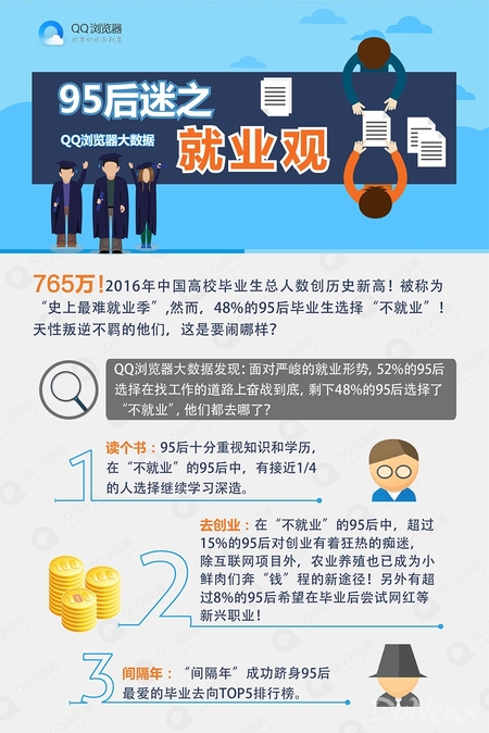 近日,QQ瀏覽器發(fā)布了關(guān)于2016高校畢業(yè)生畢業(yè)去向的大數(shù)據(jù)報告,——《QQ瀏覽器大數(shù)據(jù):95后迷之就業(yè)觀!》。報告顯示,2016年高校畢業(yè)生不再僅僅局限于傳統(tǒng)的就業(yè)觀念與渠道,而在畢業(yè)去向選擇上呈現(xiàn)多元化、網(wǎng)絡(luò)化、娛樂化的三大新趨勢。