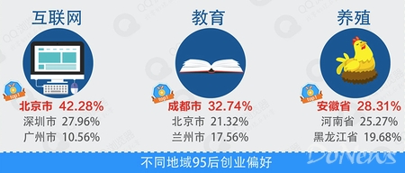 報告顯示,來自北京的95后們對互聯(lián)網(wǎng)的關(guān)注指數(shù)最高,天府之國的95后們對教育培訓(xùn)最感興趣,而不少來自安徽、河南和東三省的95后們走上了養(yǎng)殖致富的道路!