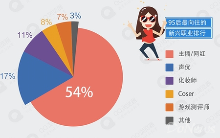 而作為跟隨互聯(lián)網(wǎng)發(fā)展而成長起來的一代人,95后還非常敢于嘗試由互聯(lián)網(wǎng)所催生的各種新鮮職業(yè)。在如今人人都能當(dāng)主播的年代,95后分分鐘拿起手機(jī)做網(wǎng)紅,月薪10萬不是夢!報告顯示,在95后最向往的新興職業(yè)排行榜中,絕大多數(shù)人選擇了主播職業(yè),其次排名為網(wǎng)紅、聲優(yōu)、化妝師、coser等。