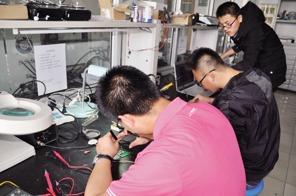 內蒙古大學電子信息學院學生在“創(chuàng)新之家”焊接智能車線路板。記者 李倩 攝