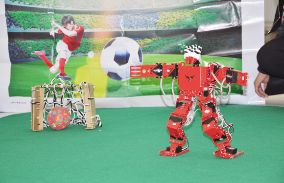 內蒙古大學創(chuàng)新創(chuàng)業(yè)論壇上,學生們展示自己設計制作的機器人守門員。記者 章奎 攝