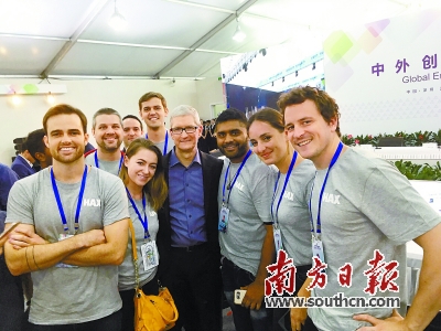 在10月12日下午召開的中外創(chuàng)客領(lǐng)袖座談會(huì)上,來自HAX孵化器的約10名國(guó)際創(chuàng)客在座談會(huì)上分享最新成果,暢談發(fā)展理念。在會(huì)議間隙,這些國(guó)際創(chuàng)客還“逮”住蘋果公司CEO蒂姆·庫(kù)克合影。