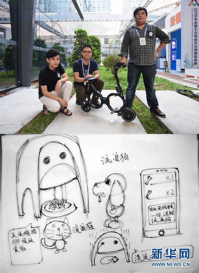 上圖:10月13日,來自不可能科技(深圳)有限公司的董世豪、李明和尹銳(從左到右)展示impossible智能背包車,他們自主研發(fā)的這款車折疊后可以收納進(jìn)雙肩包,整車僅重7公斤,電池續(xù)航達(dá)20公里;下圖:董世豪繪圖表示,希望能做一個自動流浪貓狗喂食器,機(jī)器設(shè)置在流浪貓狗長期出沒的位置,愛心人士可以通過app給貓狗購買貓糧或狗糧投喂(拼版照片)。新華社記者毛思倩攝