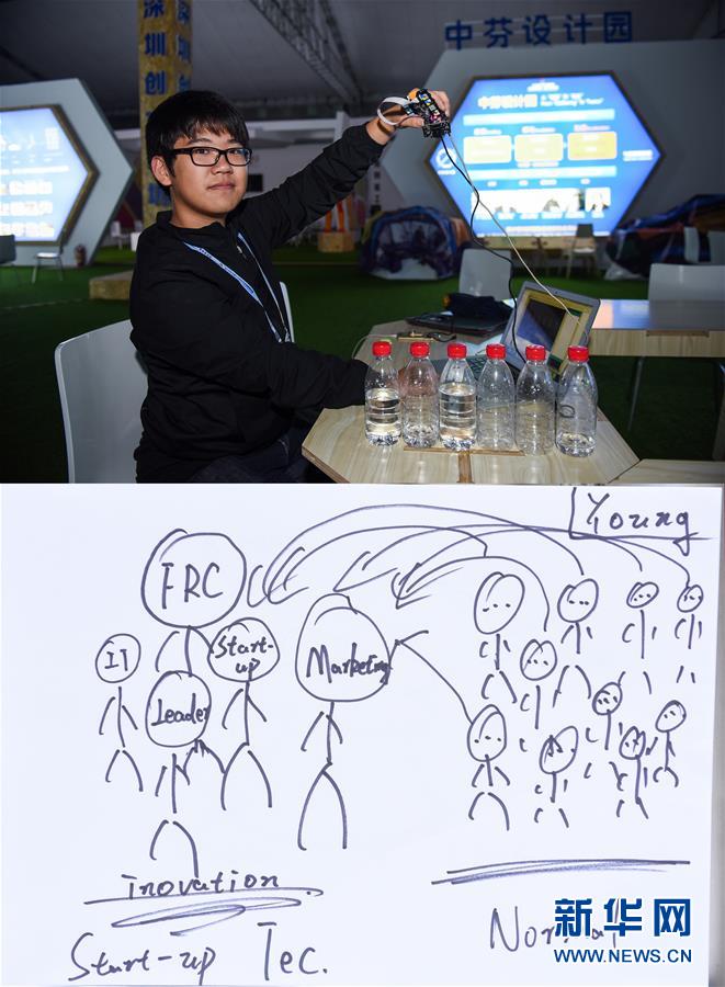 上圖:10月12日,深圳本土“小創(chuàng)客”吳子謙展示他帶來的作品——產(chǎn)品庫存感應(yīng)儀,今年19歲的他已經(jīng)申請了40多項專利;下圖:吳子謙繪圖表示,他未來計劃就讀教育專業(yè),成為一個能幫助越來越多年輕人實現(xiàn)創(chuàng)客理想的人,讓大家根據(jù)能力擔(dān)任創(chuàng)業(yè)團(tuán)隊的領(lǐng)導(dǎo)者、軟硬件研發(fā)人員、市場專員等(拼版照片)。新華社記者毛思倩攝