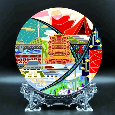 武漢地標(biāo)創(chuàng)意擺件—設(shè)計(jì)風(fēng)格以楚文化漆器為主導(dǎo),涵蓋了武漢的歷史、文化和科技。采用類(lèi)似西方教堂玻璃彩色花窗的設(shè)色與構(gòu)圖。不僅有楚文明對(duì)盤(pán)面設(shè)計(jì)的影響和象征歷史的黃鶴樓、辛亥革命紀(jì)念館,也加入了標(biāo)志著武漢蓬勃發(fā)展的馬蹄蓮和造型別致的漢秀劇院等現(xiàn)代新興元素。