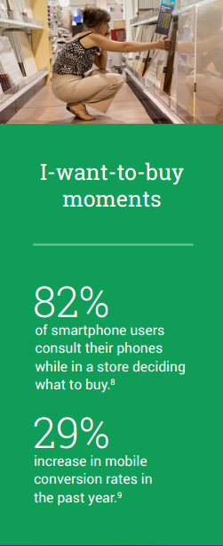 “我想要買…”的時(shí)刻,是指當(dāng)消費(fèi)者掏出智能手機(jī)比較價(jià)格或查看評(píng)論并做出購(gòu)買決定的時(shí)刻。如今,我們期待消費(fèi)者在長(zhǎng)期購(gòu)買行為中進(jìn)行在線搜索與研究;然而購(gòu)物者在出現(xiàn)購(gòu)買意愿時(shí)往往習(xí)慣求助于他們的移動(dòng)設(shè)備,即便他們正身處零售店內(nèi)或位于距離零售店很近的地方。阿迪達(dá)斯(Adidas)意識(shí)到這個(gè)趨勢(shì)的到來(lái),開始將位置信息應(yīng)用到在線廣告來(lái)引導(dǎo)購(gòu)物者到達(dá)店內(nèi)?吹揭韵逻@些數(shù)據(jù),很容易就能了解其中緣由: