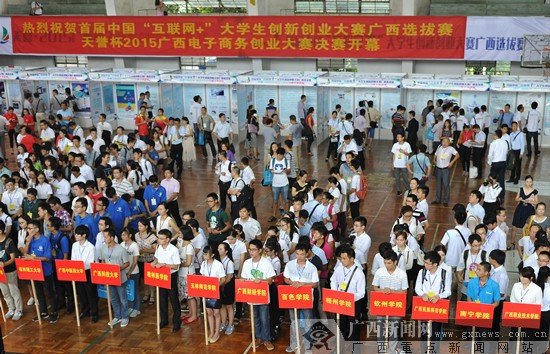 目前廣西區(qū)賽共計43個院校報名,其中990個項目團隊參加首屆“互聯(lián)網(wǎng)+”大學(xué)生創(chuàng)新創(chuàng)業(yè)大賽,585個團隊參加電子商務(wù)創(chuàng)業(yè)大賽,雙賽共計1575個項目團隊參賽,參賽學(xué)生達7875人。