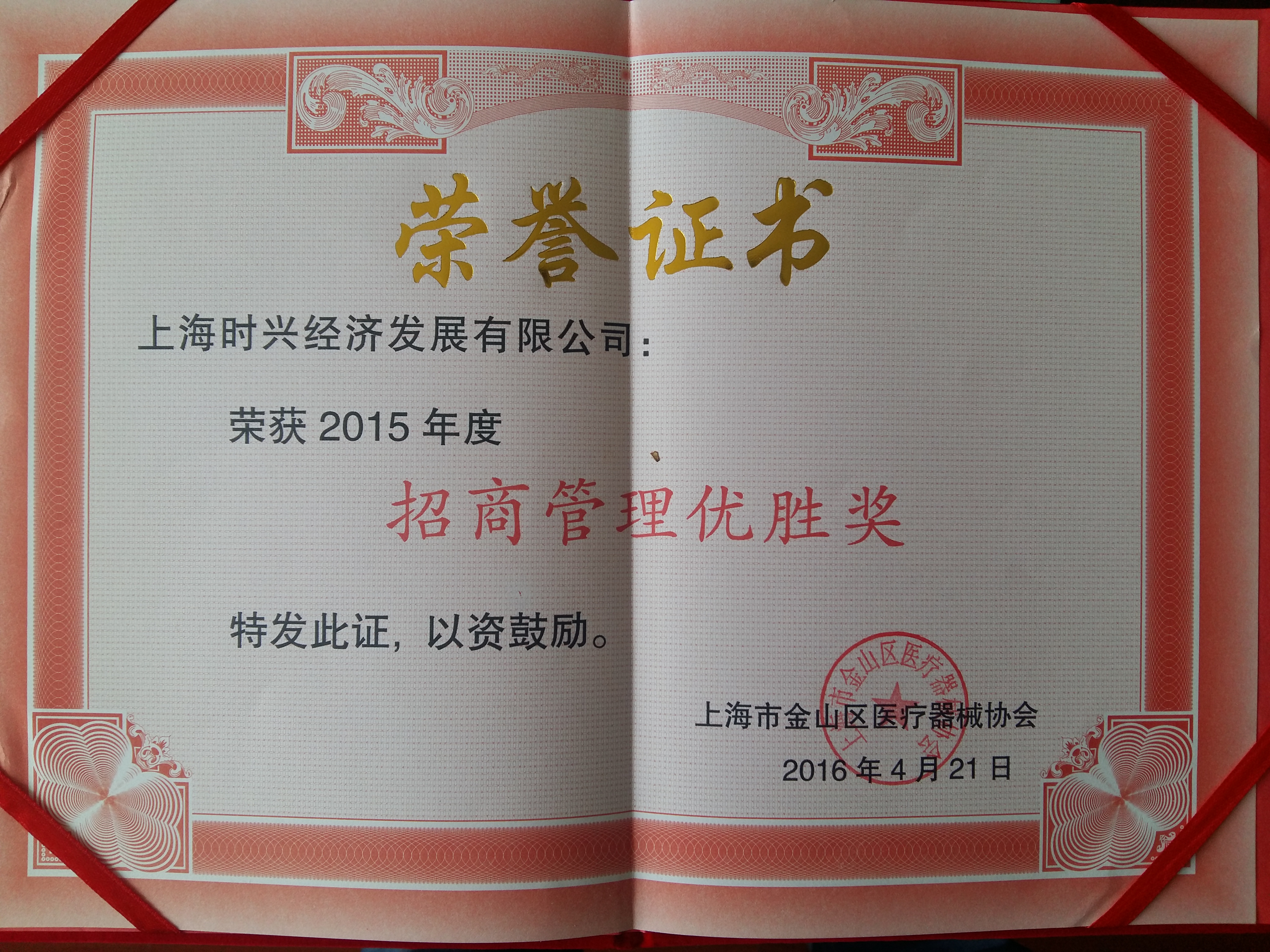 4月21日下午金山區(qū)醫(yī)療器械協(xié)會(huì)召開(kāi)第二屆第二次會(huì)員大會(huì),上海時(shí)興經(jīng)濟(jì)發(fā)展有限公司榮獲2015年度招商管理優(yōu)勝獎(jiǎng),注冊(cè)在時(shí)興經(jīng)濟(jì)小區(qū)的企業(yè)上海契克實(shí)業(yè)有限公司榮獲2015年度納稅貢獻(xiàn)獎(jiǎng)。