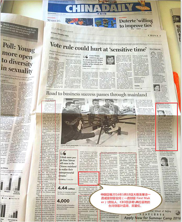 一品創(chuàng)客兩位臺(tái)灣創(chuàng)客風(fēng)采占了記者三分之二以上的筆墨。接下來,就一起來看看《中國(guó)日?qǐng)?bào)》報(bào)道了什么?