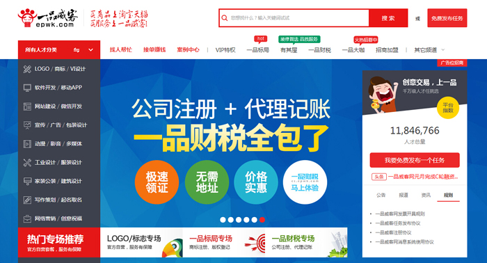 對于一個公司或企業(yè)來說,從其誕生到發(fā)展的整個過程中,與之相關的的品牌營銷、公司創(chuàng)建、傳播推廣、網(wǎng)站建設、商標注冊、法律服務甚至是融資等等,除了生產(chǎn)制造之外的環(huán)節(jié),都可以在一品威客網(wǎng)平臺上完成。