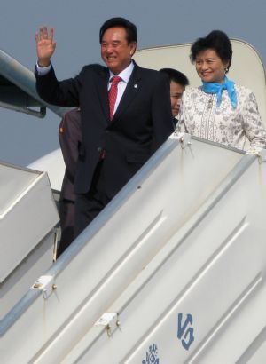 Chen Yunlin (L), president of the Chinese mainland's Association for Relations Across the Taiwan Straits (ARATS), arrives in Taichung, Taiwan, Dec. 21, 2009. Chinese mainland's chief negotiator for Taiwan affairs Chen Yunlin Monday arrived in Taichung for a new round of talks.(Xinhua/Ying Jian)