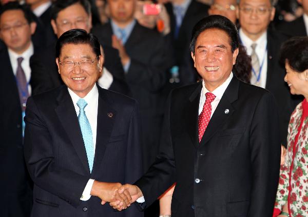 Chen Yunlin (R, front), president of Chinese mainland Association for Relations Across the Taiwan Strait (ARATS), shakes hands with Chiang Pin-kung, chairman of the Taiwan-based Strait Exchange Foundation (SEF), during the welcome ceremony held by the SEF in Taipei, southeast China's Taiwan, Dec. 20, 2010. Chen and his delegation arrived here Monday for the six round of cross-Strait talks. (Xinhua/Song Lidong)