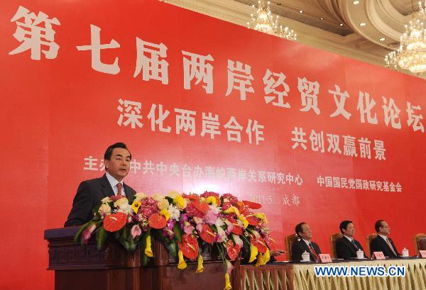 Wang Yi (L), director of the Taiwan Work Office of the Communist Party of China Central Committee, addresses the conclusion ceremony of the Cross-Strait Economic, Trade and Culture Forum, a regular forum between the Chinese mainland and Taiwan, in Chengdu, capital of southwest China's Sichuan Province, May 8, 2011. Jia Qinglin, member of the Standing Committee of the Political Bureau of the Communist Party of China (CPC) Central Committee, and Kuomintang (KMT) honorary chairman Wu Poh-hsiung attended the ceremony Sunday. (Xinhua/Rao Aimin) |