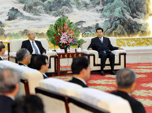 Jia Qinglin (R, back), chairman of the National Committee of the Chinese People's Political Consultative Conference (CPPCC), meets with Wu Poh-Hsiung (L, back), honorary chairman of the Kuomintang (KMT) Party, and other attendees of the eighth Cross-Strait Economic, Trade and Culture Forum in Harbin, capital of northeast China's Heilongjiang Province, July 27, 2012. (Xinhua/Li Tao