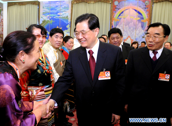 Chinese President Hu Jintao (C), who is also General Secretary of the Central Committee of the Communist Party of China (CPC) and Chairman of the Central Military Commission, visits deputies to the Fourth Session of the 11th National People's Congress (NPC) from southwest China's Tibet Autonomous Region and joins their panel discussion in Beijing, capital of China, March 6, 2011. (Xinhua/Li Xueren)
