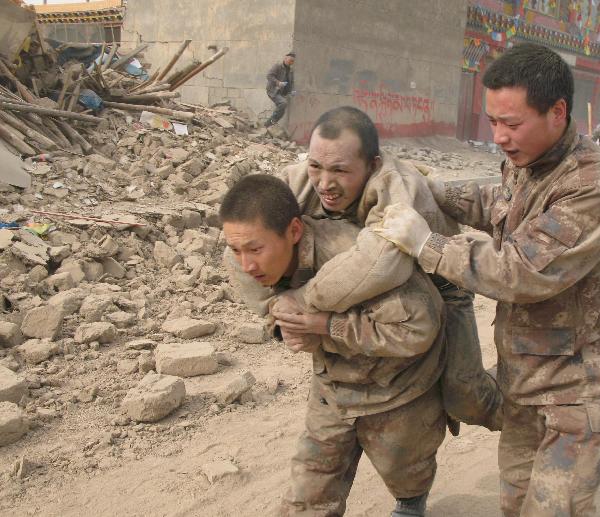 Soldiers of the Chinese People's Liberation Army rescue a survivor of quake in Yushu County, northwest China's Qinghai Province, April 14, 2010. About 400 people have died and 10,000 others were injured after a 7.1-magnitude earthquake hit Yushu early on Wednesday. (Xinhua/Wang Qiang) |