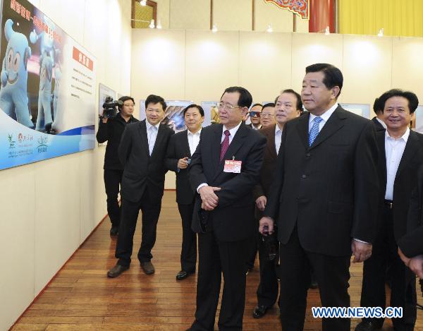 Jia Qinglin (2nd R), chairman of the National Committee of the Chinese People's Political Consultative Conference (CPPCC), visits an exhibition of photos taken from the 2010 Shanghai World Expo and processed with 3D technologies, in Beijing, capital of China, Oct. 20, 2010. (Xinhua/Xie Huanchi)