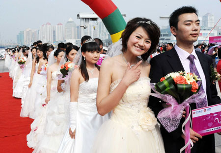 A bride smiles during a mass wedding in Qingdao, east China's Shandong Province, Sept. 27, 2009. The mass wedding, under the theme of "blessing the homeland", was attended by 60 couples. The 60th anniversary of the founding of the People's Republic of China will be celebrated on Oct. 1. (Xinhua/Chen Yehua)