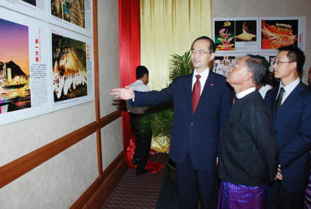 Ye Dabo (3rd R), Chinese ambassador to Myanmar, and Myanmar's First Secretary of the State Peace and Development Council General Thiha Thura Tin Aung Myint Oo (2nd R), watch the photo exhibition at a reception to celebrate the 60th founding anniversary of the People's Republic of China, in Yangon, Myanmar, Sept. 28, 2009. (Xinhua/Zhang Yunfei)