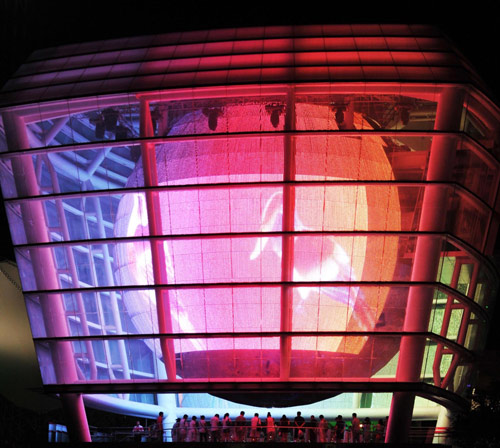 Tourists visit the sky lantern-shaped Taiwan Pavilion at the Shanghai Expo Site, August 10, 2010. The Taiwan Pavilion celebrated its 400,000th visitor on Tuesday. Most of the visitors have flown electronic sky lanterns, known as Kongming Lanterns in China, which are used to make wishes and pray for safety and happiness during festivals and celebrations in Taiwan. [Photo/Xinhua]