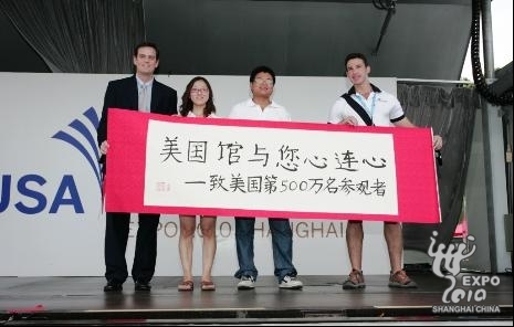 The USA Pavilion achieved a record attendance of 5 million visitors today. A man surnamed Lv from Kunshan, Jiangsu Province, became the lucky 5 millionth visitor and received a calligraphy scroll as souvenir.
