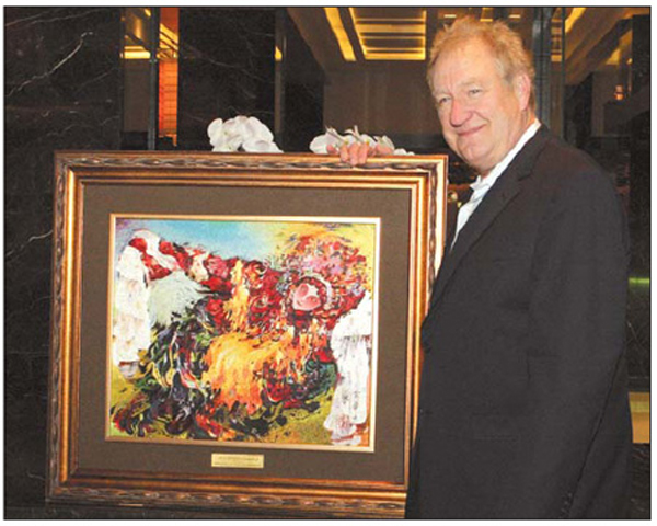 The executive committee of the 2007 Special Olympics World Summer Games presents an embroidery piece of Liu Linghua's oil painting Drunken Beauty to the director-general of the Game's opening ceremony Don Mischer.(Source: China Daily)