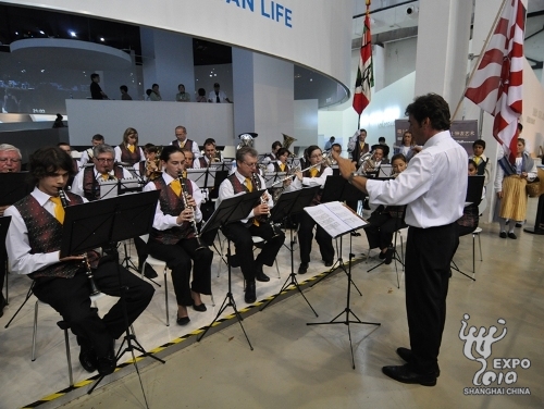 The Meyrin-Geneva Municipal Brass Band entertains visitors at the Geneva-Zurich-Basel Pavilion with a fusion of classic, jazz and modern rhyme.