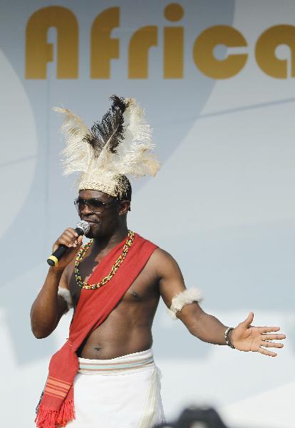 A Kenyan artist sings in the Shanghai World Expo Park in Shanghai, east China, Sept. 16, 2010. Kenyan dancers on Thursday displayed several Kenyan traditional celebration scenes such as enthronement ceremony of a tribe chief and civilian wedding ceremony. (Xinhua/Pei Xin)