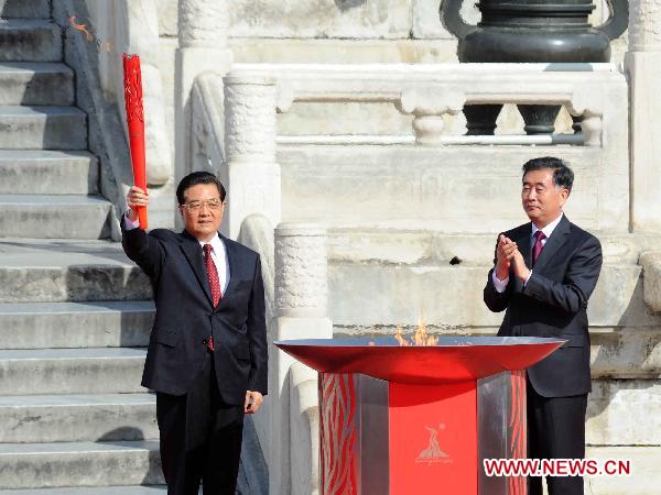 Chinese President Hu Jintao(L) holds high the torch during the torch lighting ceremony of the 2010 Guangzhou Asian Game at the Temple of Heaven in Beijing, capital of China, Oct. 12, 2010. (Xinhua/Gong Lei)