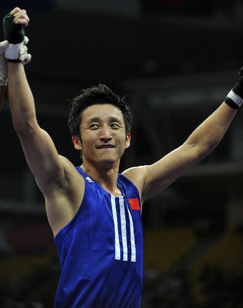 Zou Shiming (L) of China celebrates after beating Hatsanai Phoilevy of Laos during the men's boxing 46-49kg match at the 16th Asian Games in Foshan, south China's Guangdong Province, Nov. 22, 2010. Zou Shiming won the match by 13-1. (Xinhua/Gong Lei)