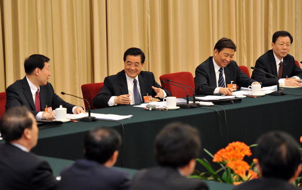 Chinese President Hu Jintao (R 3rd) joins in a panel discussion with national legislators from eastern Jiangsu Province on March 5, 2011. [Photo/Xinhua]