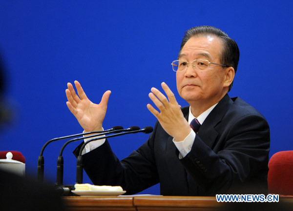 Chinese Premier Wen Jiabao answers questions during a press conference after the closing meeting of the Fourth Session of the 11th National People's Congress (NPC) at the Great Hall of the People in Beijing, China, March 14, 2011.(Xinhua/Wang Jianhua)