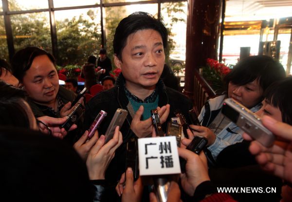 Chinese talk show presenter and culture lion Cui Yongyuan (C), also a member of the Fourth Session of the 11th National Committee of the Chinese People's Political Consultative Conference (CPPCC), speaks to media in Beijing, capital of China, March 2, 2011. The Fourth Session of the 11th CPPCC National Committee is scheduled to open on March 3. (Xinhua/Xing Guangli)