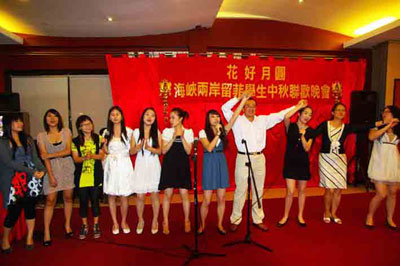 在中國傳統(tǒng)節(jié)日—中秋節(jié)即將來臨之際,為豐富海峽兩岸留菲學(xué)生的業(yè)余生活,加強(qiáng)兩岸留菲學(xué)生的情感交流,中國駐菲使館于2010年9月19日組織了一場“花好月圓-海峽兩岸留菲學(xué)生中秋聯(lián)歡晚會”,約120余名兩岸留菲學(xué)生歡聚一堂,在馬尼拉共度中秋佳節(jié)。駐菲律賓大使劉建超出席聯(lián)歡晚會并與同學(xué)們促膝交談。