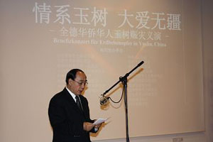 2010年4月27日晚,全德華僑華人聯(lián)合總會、全德華人社團聯(lián)合會、旅德華僑華人中國和平統(tǒng)一促進會、柏林中國婦女聯(lián)誼會等20多個僑團以及中國留德學(xué)生學(xué)者聯(lián)合會等在柏林中國文化中心舉辦“情系玉樹、大愛無疆——全德華僑華人玉樹賑災(zāi)義演”活動。中國駐德國大使吳紅波、領(lǐng)事部主任湯文娟參贊以及旅德華僑華人、留學(xué)生代表200余人出席。演出開始前,播放了玉樹地震受災(zāi)以及救援人員奮勇抗災(zāi)記錄短片,之后全體人員肅立默哀1分鐘,深切悼念在玉樹地震中不幸遇難的同胞。