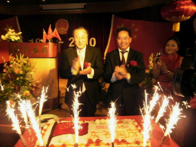 張軍大使點(diǎn)燃國(guó)慶蛋糕上的燭光